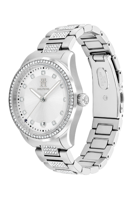 | Tip sata: Ručni sat Tip mehanizma: Kvarcni Tip narukvice: Čelik Tip stakla: Mineralno Materijal kućišta: Čelik Prečnik kućišta: 36 mm Oblik kućišta: Okruglo Vrsta kopče: Preklopna Dodatne funkcije: Datum Vodootpronost: 50 metara Prikaz: Analogni Boja narukvice: Srebrna Boja brojčanika: Srebrna Boja kućišta: Srebrna Garancija na mehanizam: 25 meseca |
